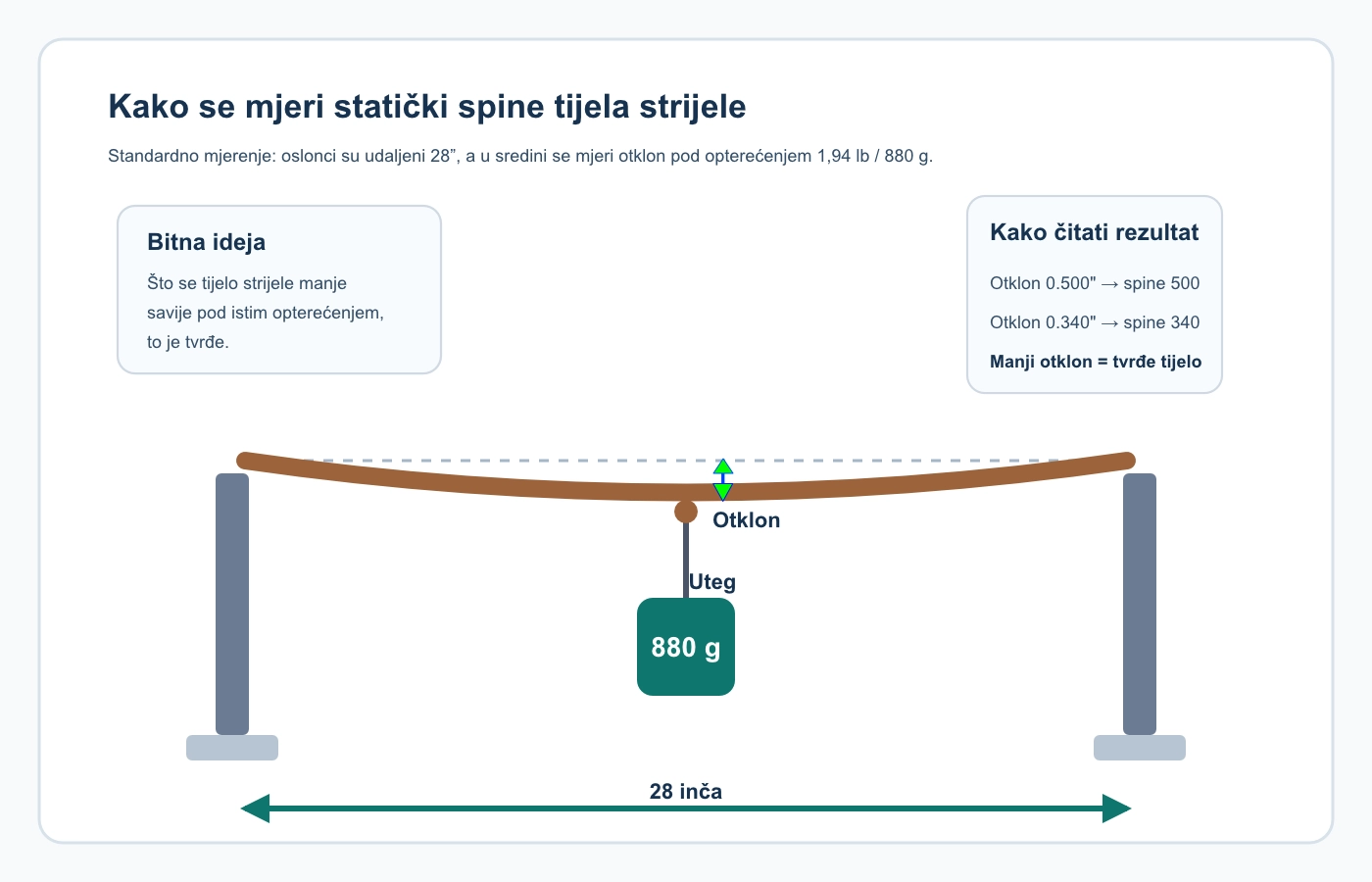 Kod odabira strijela mnogi prvo gledaju duljinu, promjer, težinu vrha ili materijal tijela strijele. Ipak, jedna od najvažnijih karakteristika svake strijele je spine – krutost tijela strijele i način na koji se to tijelo savija pri izlasku iz luka. Dobar spine znači lakši tuning, čišći izlaz iz luka, predvidljiviji let i manju potrebu za “spašavanjem” setupa kasnijim korekcijama. Loš spine često daje simptome koji izgledaju kao loša tehnika, loš nišan, loš button ili “čudan” luk, iako je korijen problema zapravo u neusklađenoj strijeli.