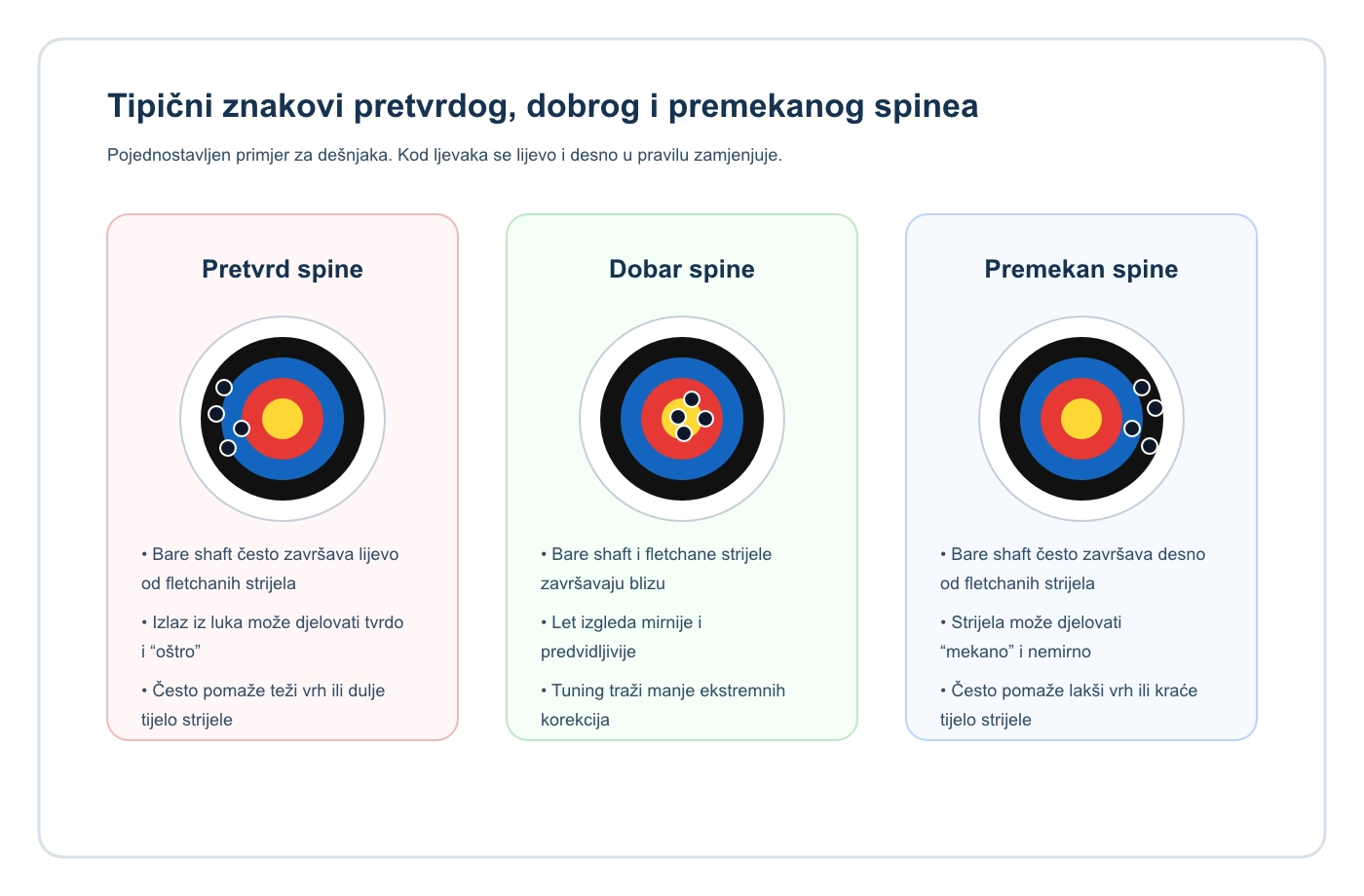 Mnogi traže jednostavan odgovor tipa “ako je pretvrdo, gađa lijevo; ako je premekano, gađa desno”. To često može biti koristan početni trag, ali nije dovoljno samo po sebi. Smjer odstupanja ovisi i o tome je li streličar dešnjak ili ljevak, kakav je test napravljen, koristi li se button, koliki je crawl kod barebowa i je li problem uistinu spine ili tehnika.
